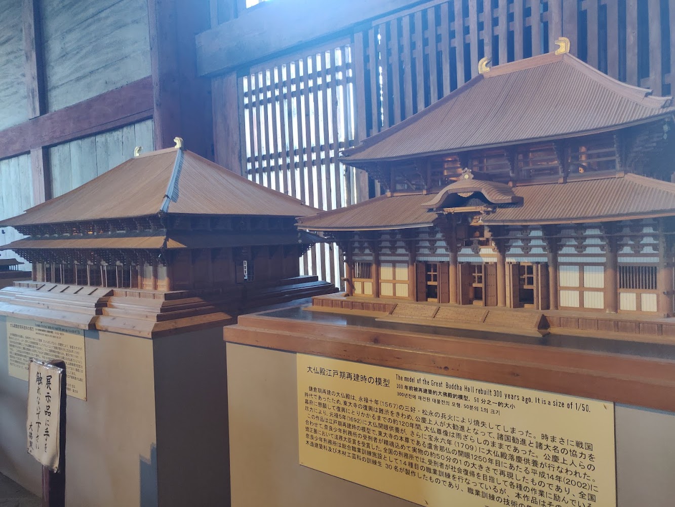 Like most wooden buildings in Japan, Todaiji was built and burned down, and rebuilt and burned down and left to sit for a couple hundred years and rebuilt again, and the different versions didn't all look the same, as you can see from the models below. (it's still the same temple though!)