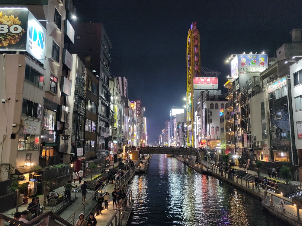 The Glico running man and enormous animatronic crab are both famous.