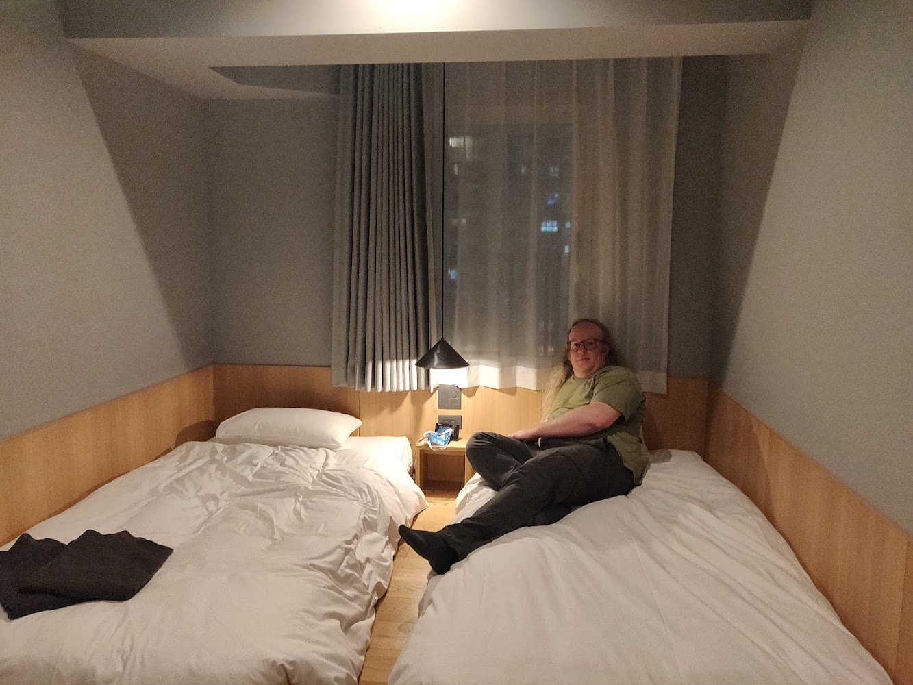 Our final hotel was absolutely the worst. I think it was a cheap hotel in an expensive location. It was Western-style with raised beds and TV, but barely enough room to walk around in and no room for luggage. Worst of all was the bathroom, which took the functional-and-cozy layouts of previous hotel bathrooms and shrunk it just enough to become unusably tiny. Additionally, the 10" step into the bathroom tripped James every time he entered or exited.