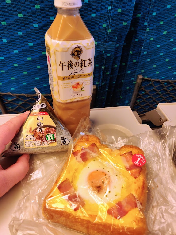 We took a day trip to Himeji! I continue to enjoy the Shinkansen, and was amused that the trains used to have pay phones available. Our standard breakfast was onigiri and milk tea from a convenience store (コンビニ). That day, I tried a french toast egg thing which was terrible.