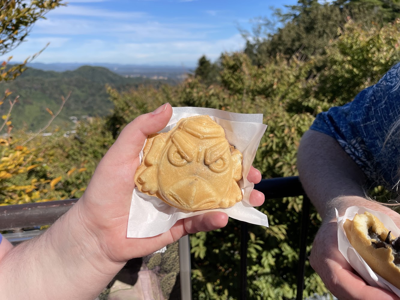 The start of my quest for taiyaki in Japan: Tengu-yaki! Normally taiyaki is a fish (tai) shaped pastry with a variety of sweet fillings, but this one was shaped like a tengu. Tengu are dangerous and protective spirits of mountains and forests who are associated with Mount Takao. It was delicious!
