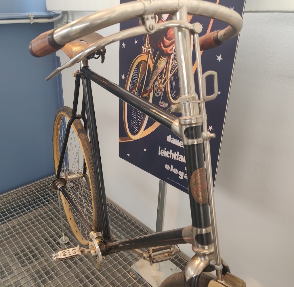 The bike section showed a lot of experiments that never caught on in the devolvement of the modern bicycle. This one shows an alternate to the bike chain - a fixed rod attached to two 90 degree gears.
