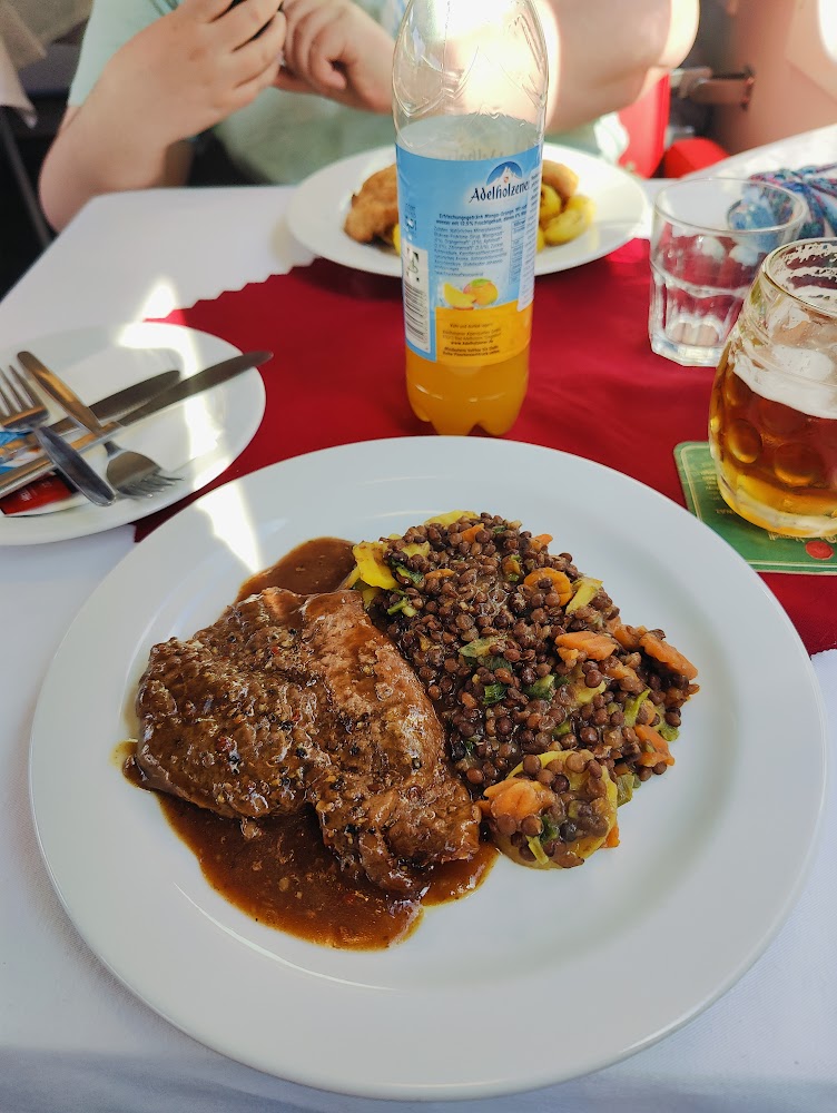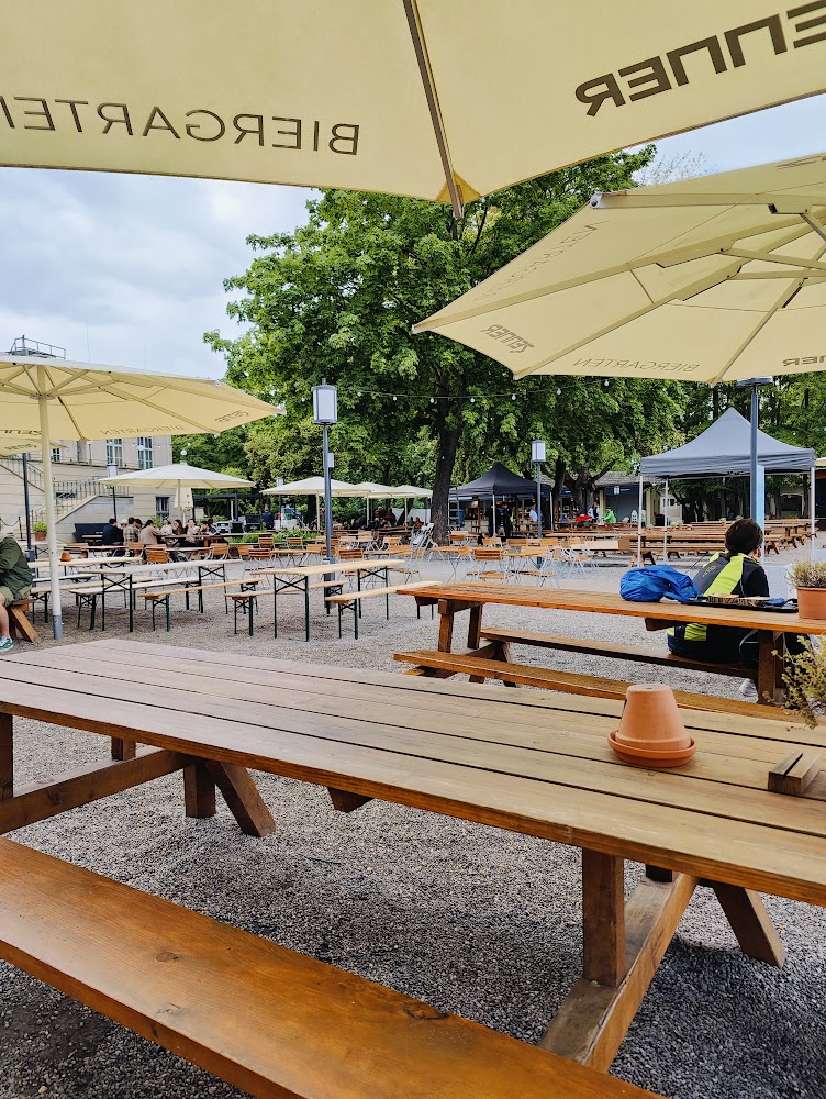 We arrived at a covered beer garden along the river just as it started raining, and I tried the classic currywurst. Delicious!