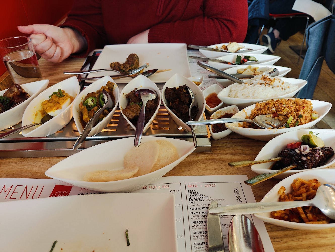 For dinner we went to Restaurant Blauw (blauw means blue, though their decor was all red) for Indonesian food and got their rijsttafel - a variety of small dishes. It had the best chicken satay I'd ever had, and everything else was tasty too. One of the best meals we had on the trip!