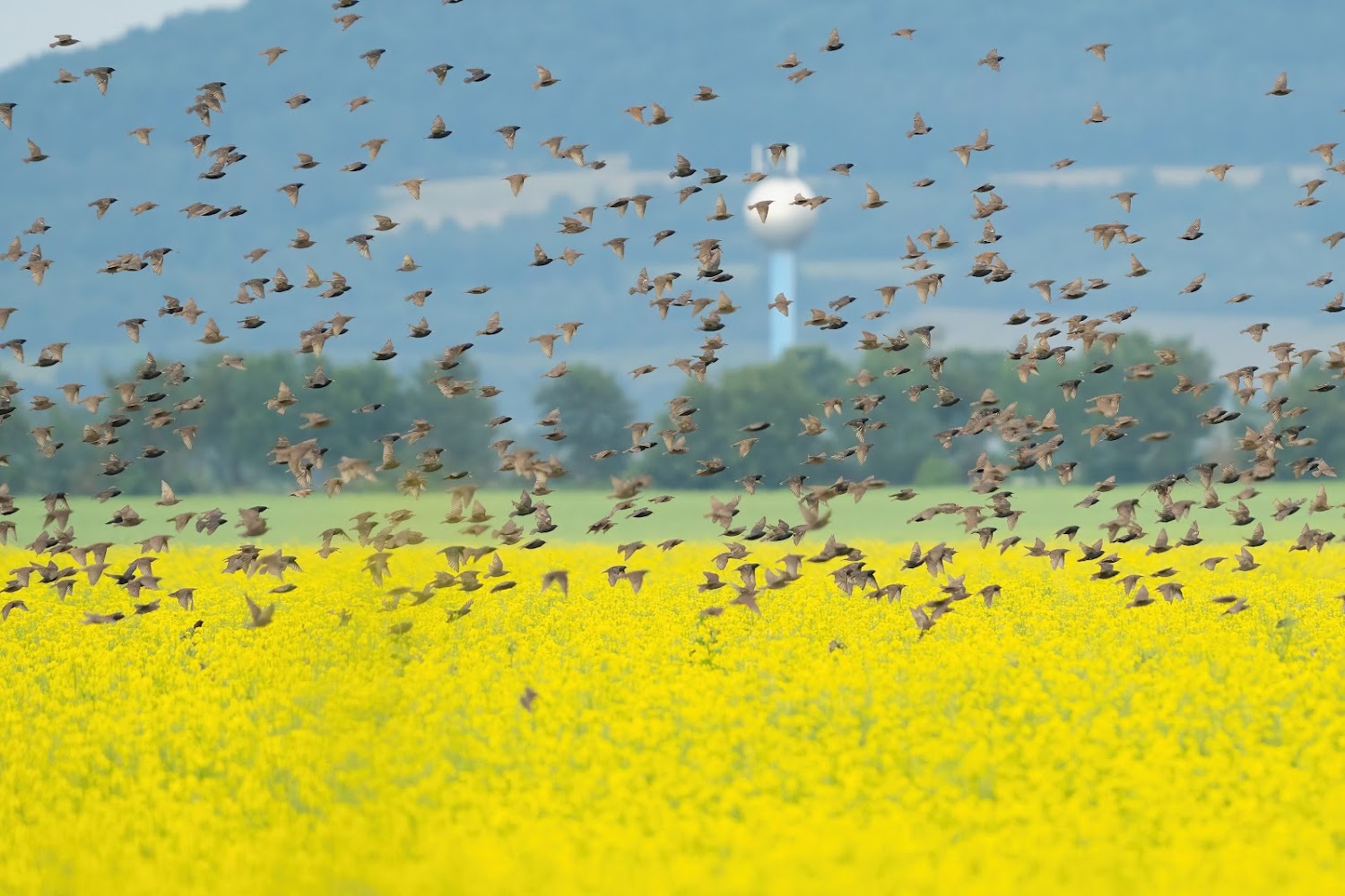 I would not have been able to identify this Common Cuckoo flying by, but since Tomáš literally wrote a book on them he was able to point it out with ease! The starlings are flying in front of a Canola field (a Canadian cultivar!) that nothing locally eats - great for agriculture, bad for the local ecosystem.