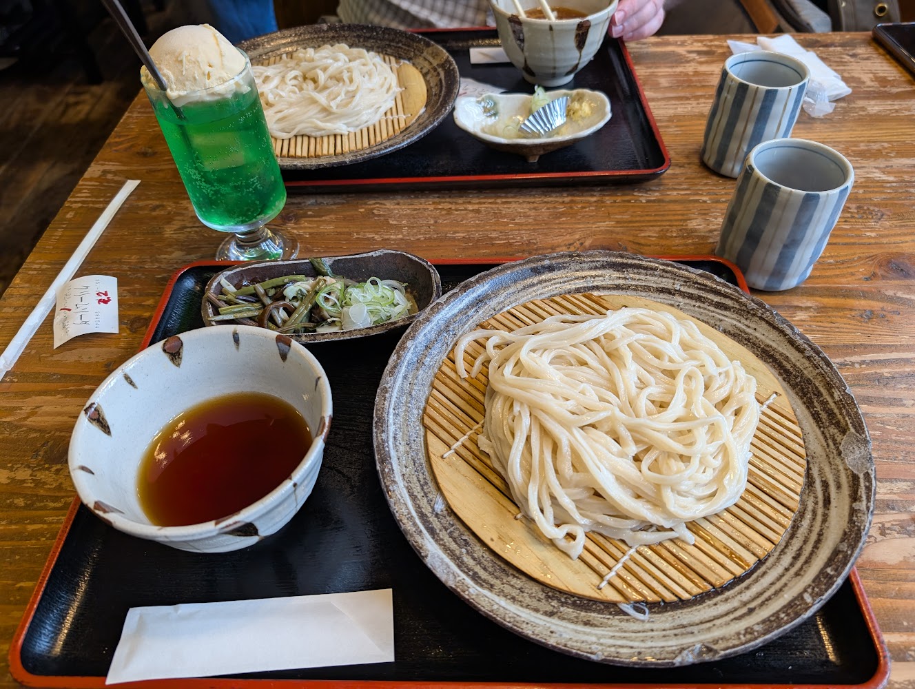 We stopped for lunch and got zaru udon (cold noodles and dipping sauce) at a modern restaurant hidden behind a historic facade. Cream soda is green in Japan!