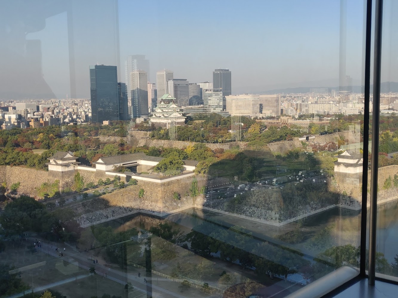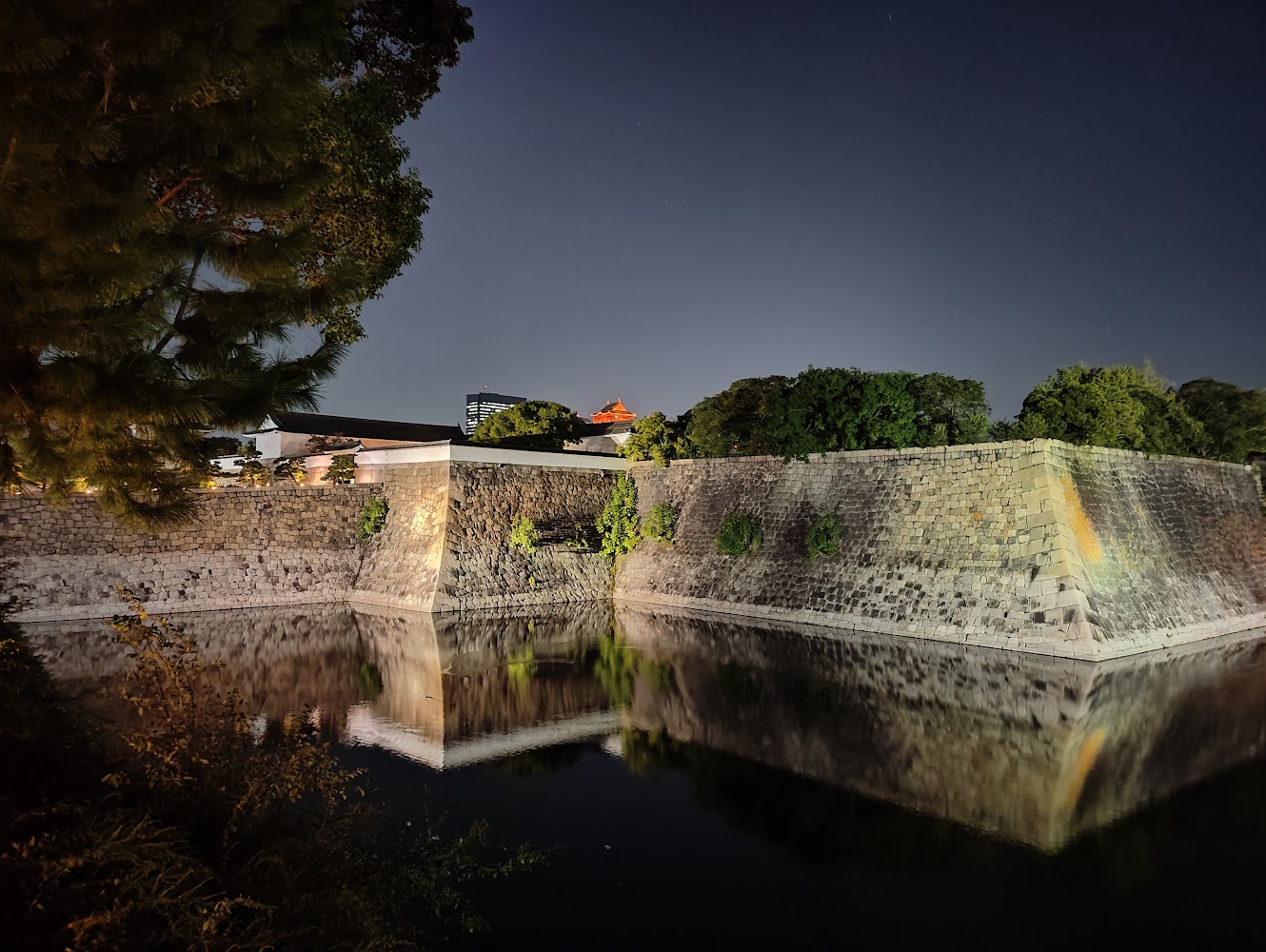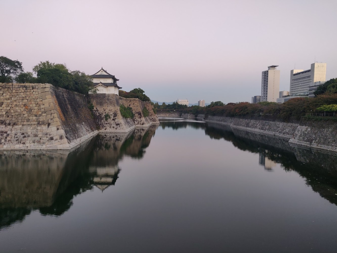 After the museum, we watched the sun set by Osaka Castle's moat. Like many historic buildings, Osaka Castle is lit up at night.