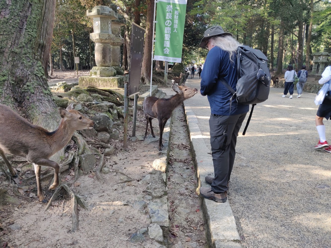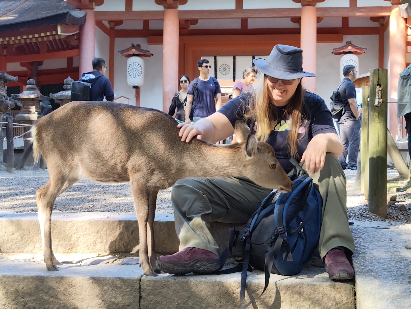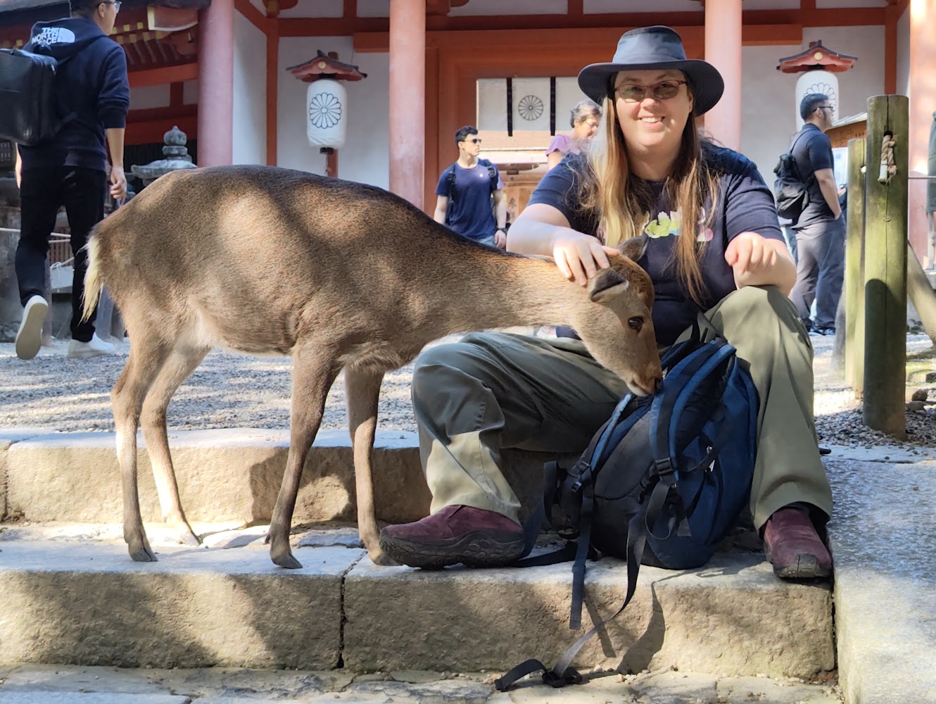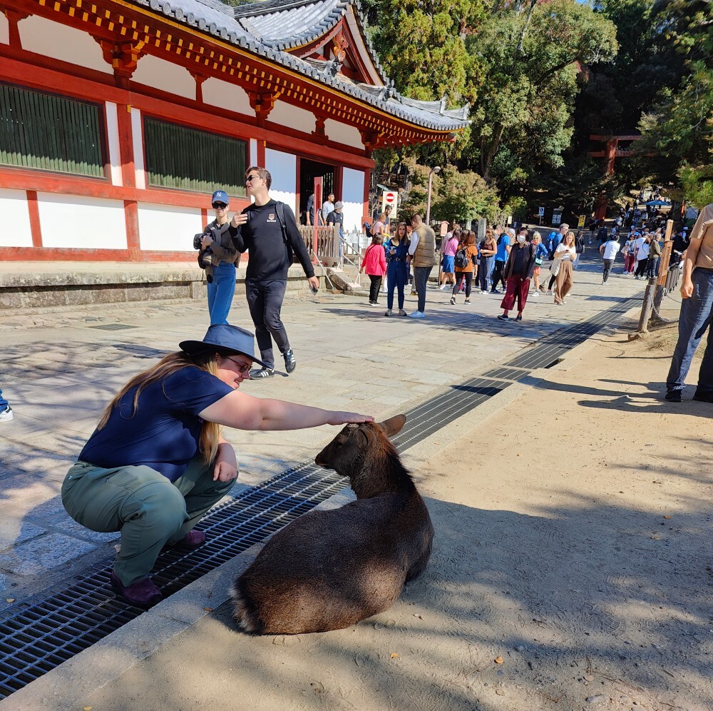 The other thing Nara is famous for is the deer! The deer are believed to be messengers of the Shinto gods and left to roam freely, but the only message we noticed was a strong desire for deer biscuits from tourists. They're very polite and know to bow to get a deer biscuit. The deer around the shrines were pretty chill, but in the park were roving gangs of deer waiting to find an unsuspecting tourist with deer biscuits and nip at them until they dropped the whole package of deer biscuits and fled.