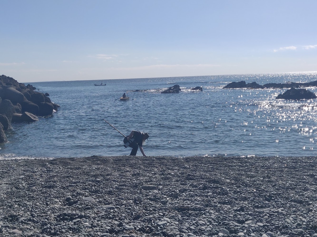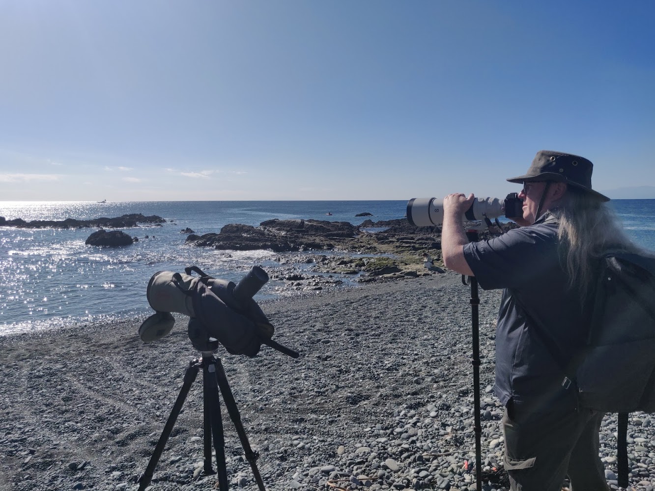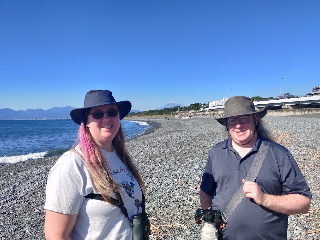 First stop: the ocean, hoping for White-bellied Green Pigeons (アオバト). These fruit eating pigeons often drink seawater! It's uncertain exactly why, but probably related to needing salt when they breed. Unfortunately, they didn't show up for us, even though this spot is so well known for White-bellied Green Pigeons that google has a marker for it. We did touch the other side of the the Pacific Ocean though!
