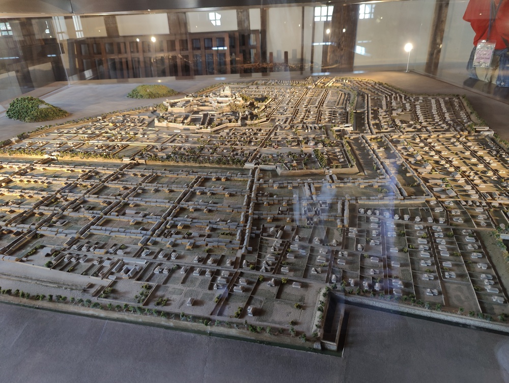 The museum itself was amazing! I love local museums and this one was exemplary. The museum exhibits also matched a common pattern we saw in descriptions of Japanese history. The historic record starts in the 600s with the arrival of Buddhism and the foundation of many monastaries. In this museum, it started with information about the Naniwa palace from the 600s - the archeological site was visible from the museum! - and a diorama of what it might have looked like.