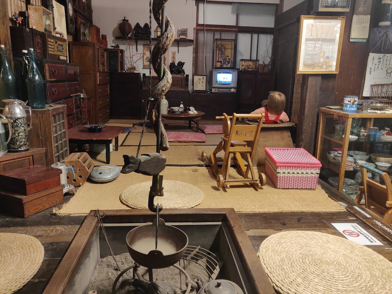 I was fascinated by the traditional living room complete with tatami and pot hanging over a fire. It was very similar to the historic ones we had just seen in the Hida Folk Village - except it had a TV! It really made me think about what a big change the "three miracle appliances" (refrigerator, washing machine, TV) were to Japan.