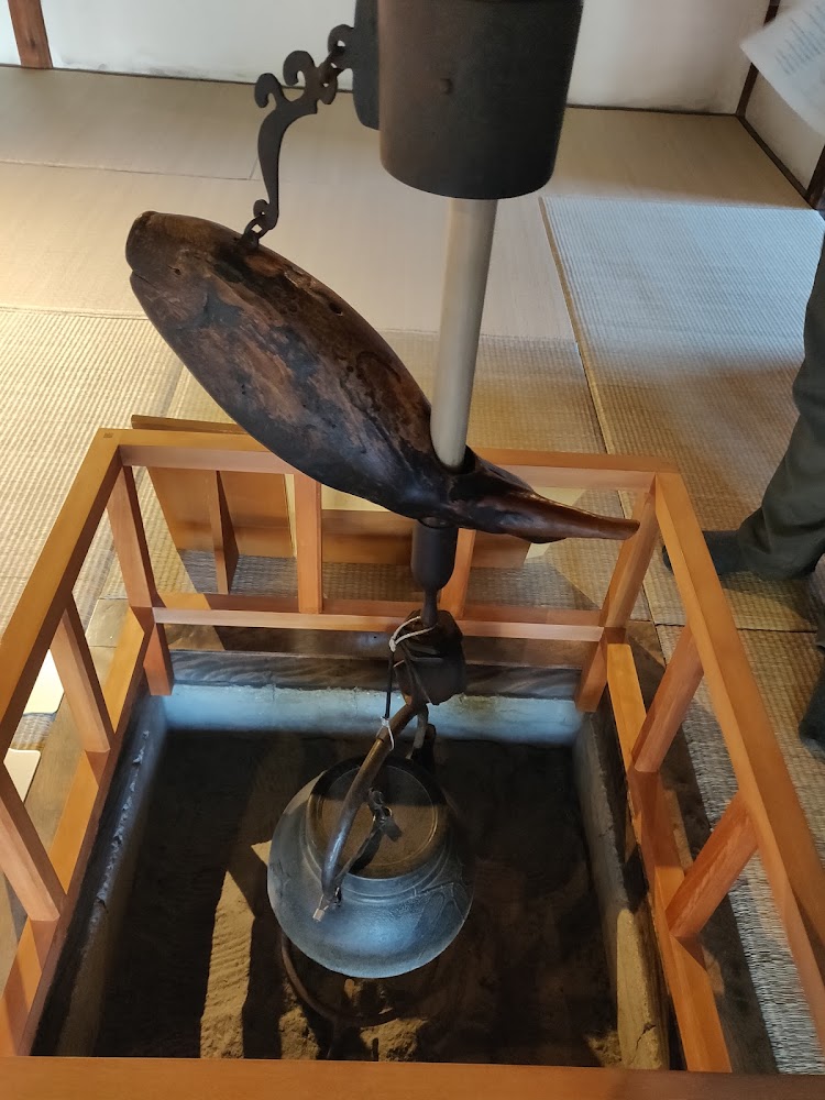 Here and in the Jinya were dirt hearths with a pot on a hook above for cooking. The pothooks were decorated, often with non-flammable imagery like fishes and closed fans, a recurring theme in traditional Japanese decorations.