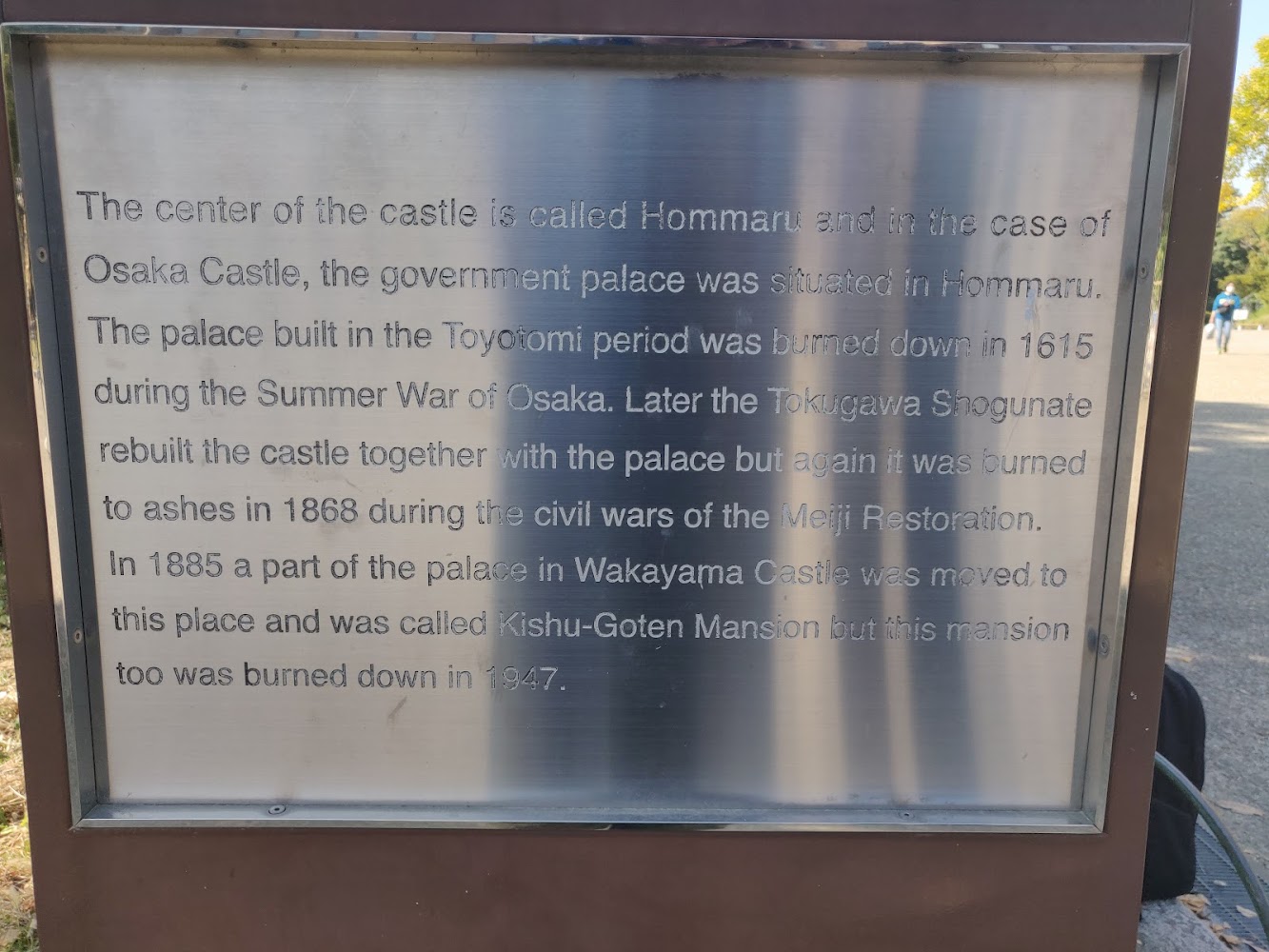 While we didn't go into Osaka Castle, I was amused by this plaque that summarized a common pattern in historic Japanese buildings: built, burned down, rebuilt during Edo, burned down, rebuilt during Meiji, now historic.