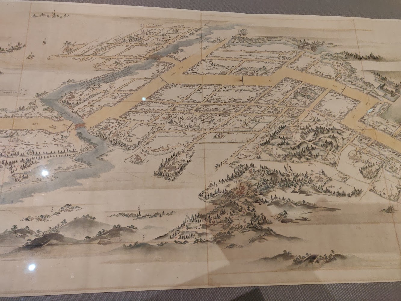 I particularly enjoyed the Ainu artifacts and this 20-foot-long historic map. I suspect the buildings and the road are not to scale.