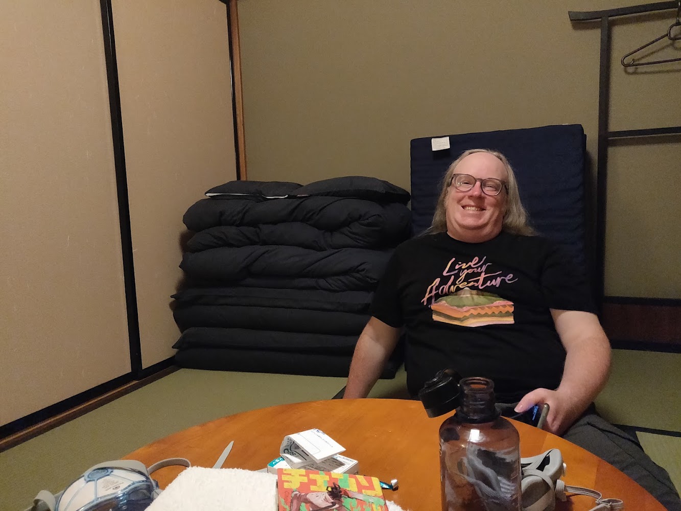 We stayed in a traditional Japanese guest house with slippers at the entrance and tatami floors and futons. It was very charming. The futons were surprisingly comfortable, and I had some nice conversations with our host in Japanese