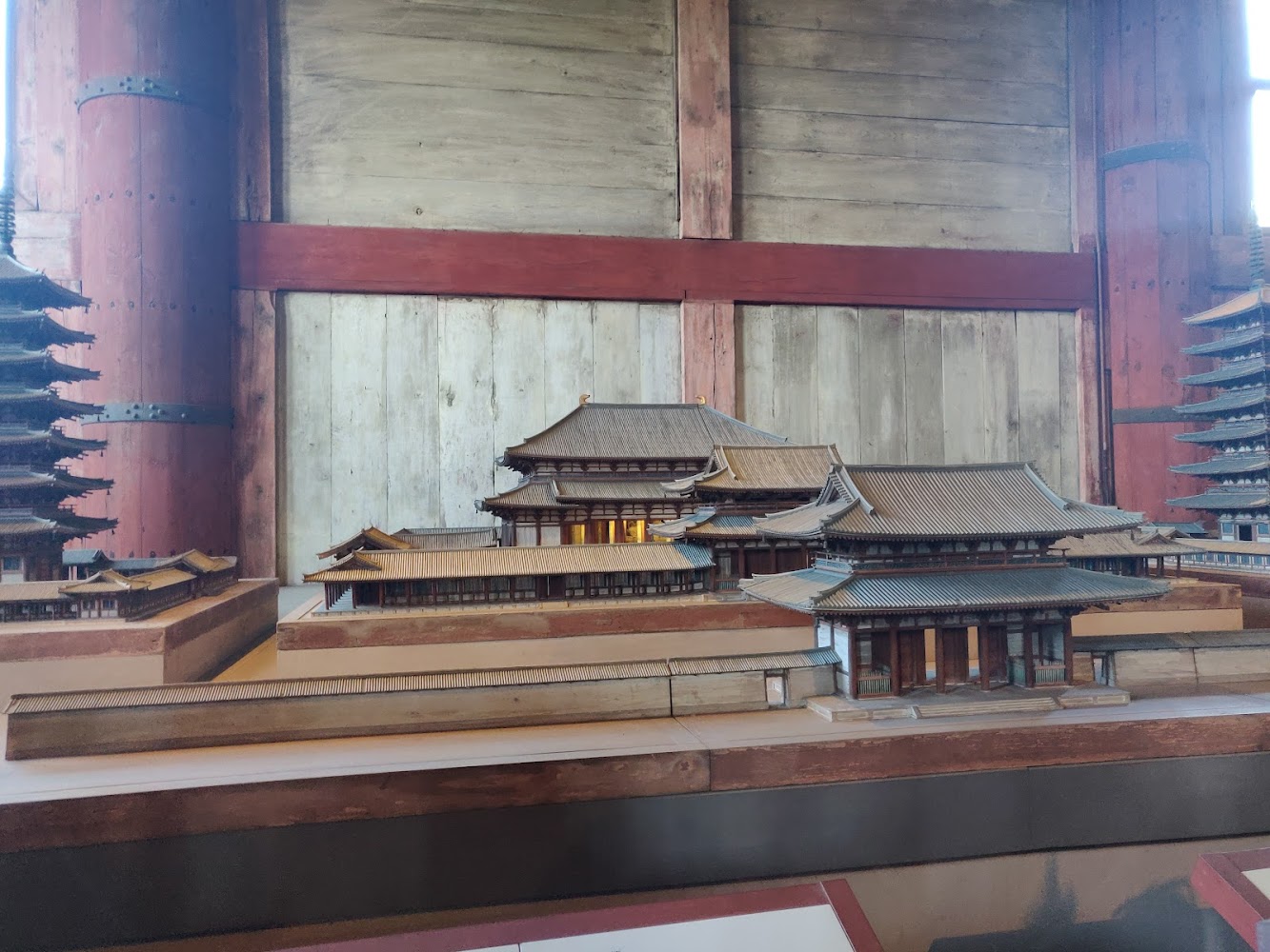 Like most wooden buildings in Japan, Todaiji was built and burned down, and rebuilt and burned down and left to sit for a couple hundred years and rebuilt again, and the different versions didn't all look the same, as you can see from the models below. (it's still the same temple though!)