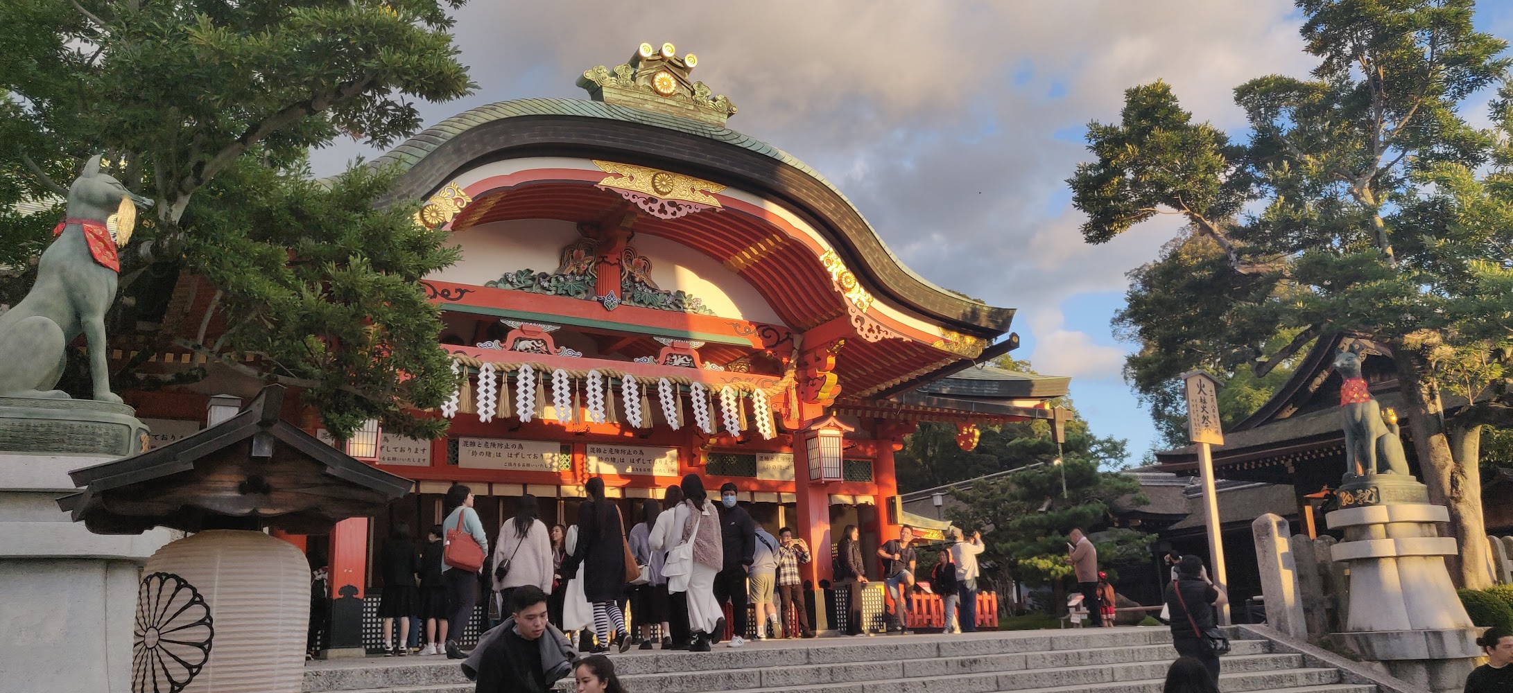 At the end of the day we visited Fushimi Inari (伏見稲荷大社), famous for its many torii gates. Despite being sunset, it was still extremely busy! Foxes are associated with Inari and there were lots of fox statues around.
