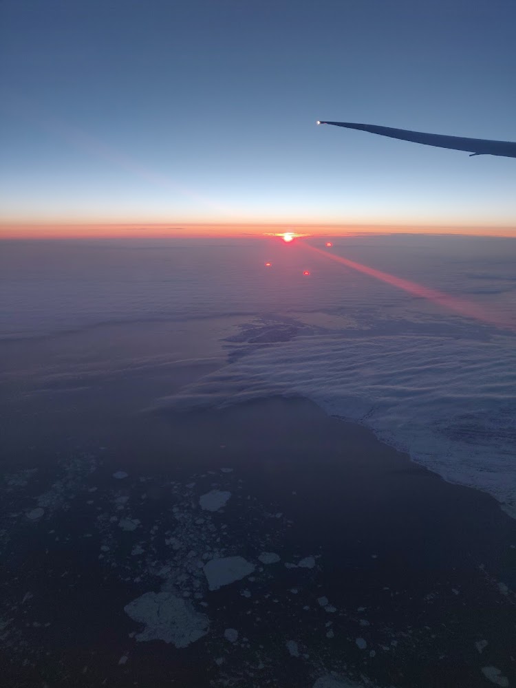 Off to Europe! Our traditional selfie in front of the aquarium in the international departures terminal, and a beautiful view of the sunrise somewhere over the north Atlantic.