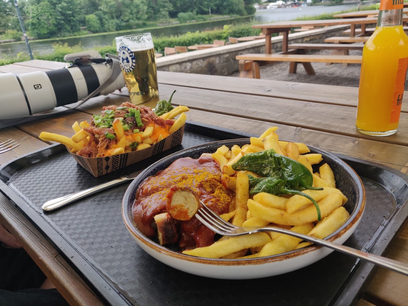 We arrived at a covered beer garden along the river just as it started raining, and I tried the classic currywurst. Delicious!