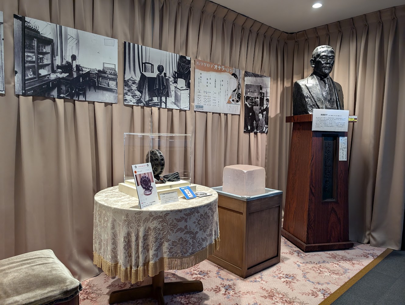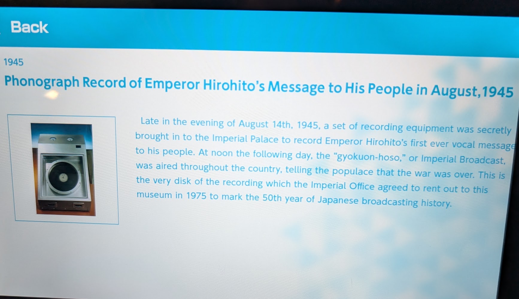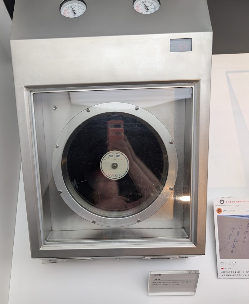 One of the most historically significant exhibits was the original recording of Emperor Hirohito's message announcing Japan's surrender at the end of WWII, and a machine of the same type it was recorded on.