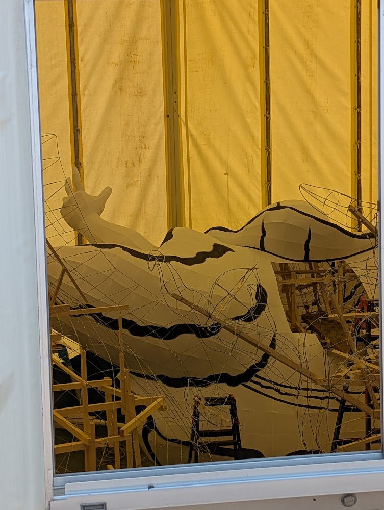 Each float is made with only wood, wire, lights and painted waxed paper. We were lucky enough to spy next year's floats under construction outside too!