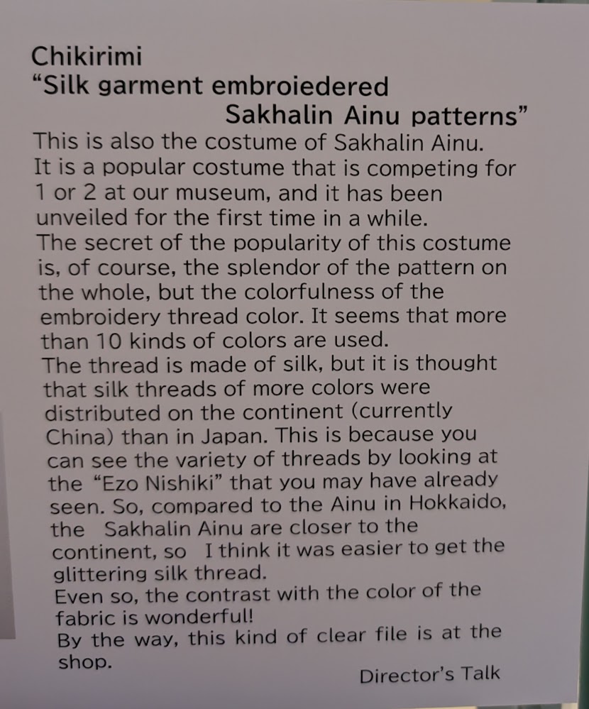 We visited several museums about the Ainu and the other native peoples of northern Japan during the trip. The first was the Hakodate City Museum of Northern Peoples. This was from the perspective of the Japanese, and focused on authentic historic artifacts. The designs the Ainu put on their clothes are beautiful and iconic.