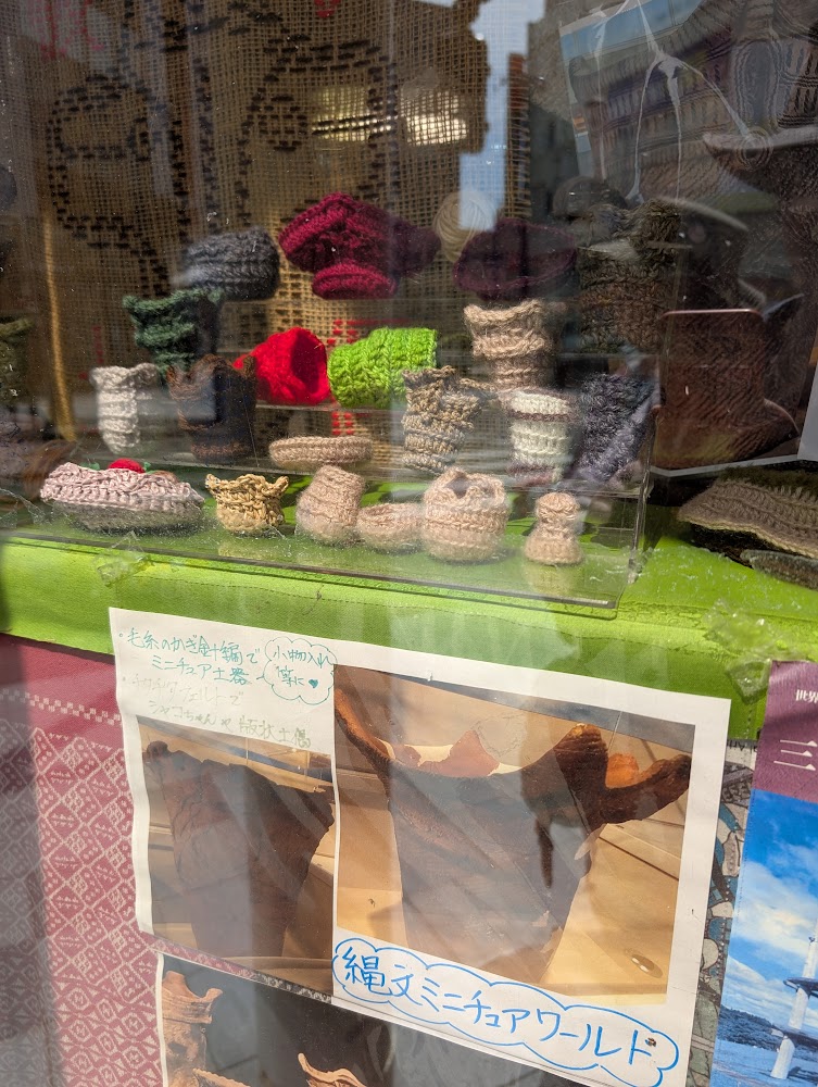 The locals are proud of the Jomon site, as evidenced by these crocheted Jomon baskets in a store downtown.