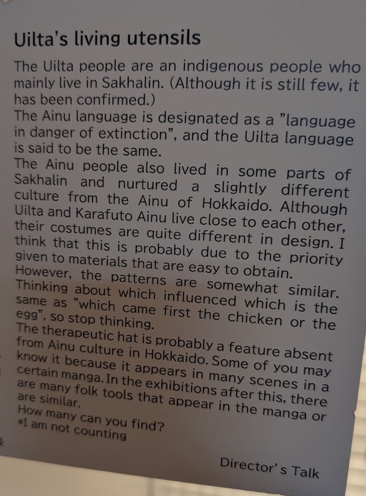 The museum covered a lot of the same stuff as the other two, but in more depth. While the Ainu are historically associated with Hokkaido, they also lived in the northern part of Honshu nearly down to the Tokyo area and up on Sakhalin (now a Russian island) in the 3rd to 7th centuries.