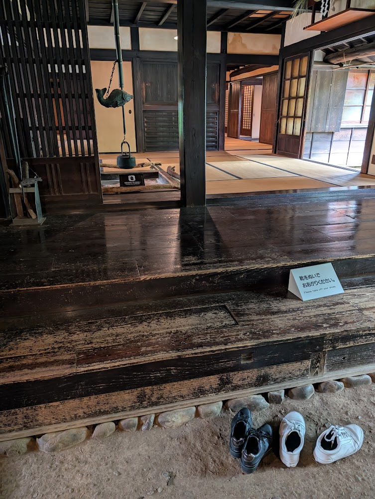 Some of the buildings were very old. The large farmhouse from the Edo period (1600s-1800s) highlights how they used different flooring for different purposes: stone floor for dirty shoes and messy work; wood for high traffic zones; and tatami mats for sitting and relaxing. The raised grain storage accessible via a ladder was a clever solution to keep mold and rats out.