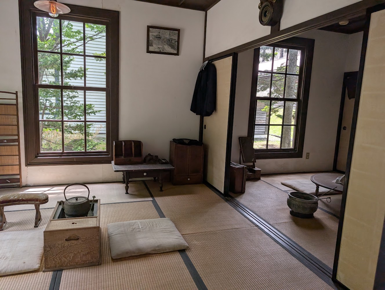 This had some fascinating mixes of Japanese and European architecture. In the first photo, the blue building was a doctor's "modern" European-style room for patients, and through a door was an entire traditional Japanese style house for him to live in. Others were more subtle, like these large European-style windows in an otherwise Japanese-style room.