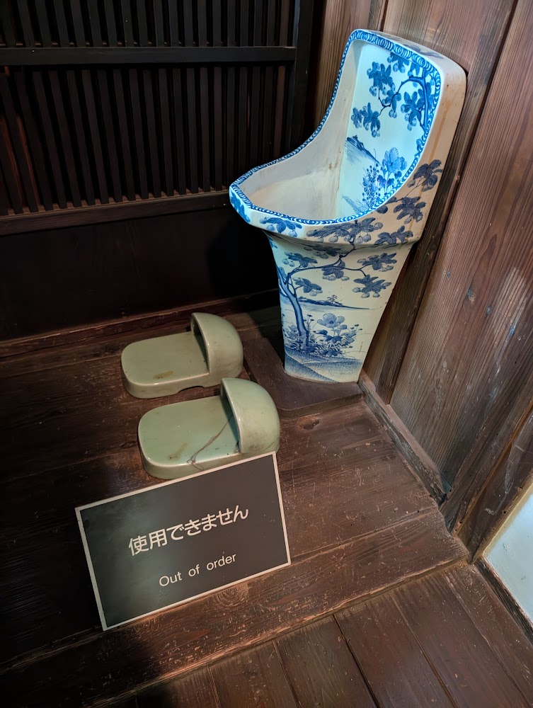 This was only a section of a sprawling Meiji era (1868-1912) estate occupied by a politician who was famously assassinated in it. I was amused by the built-in porcelain slippers for the toilet!
