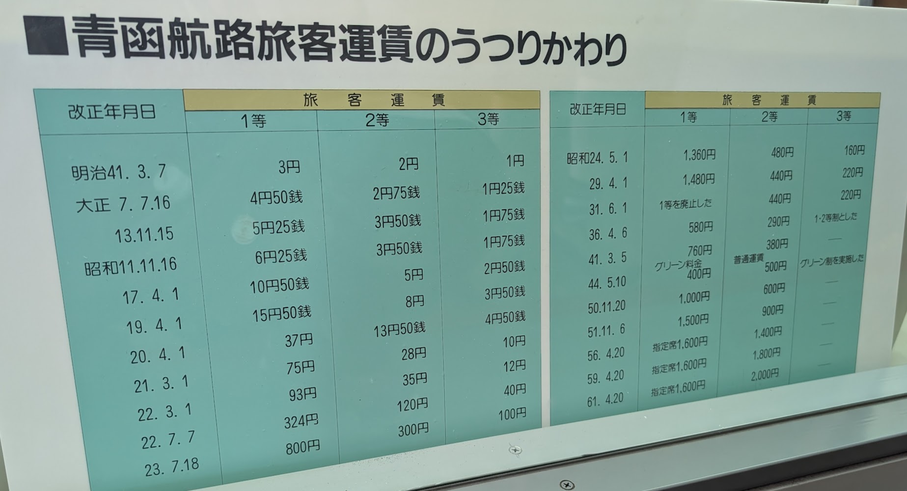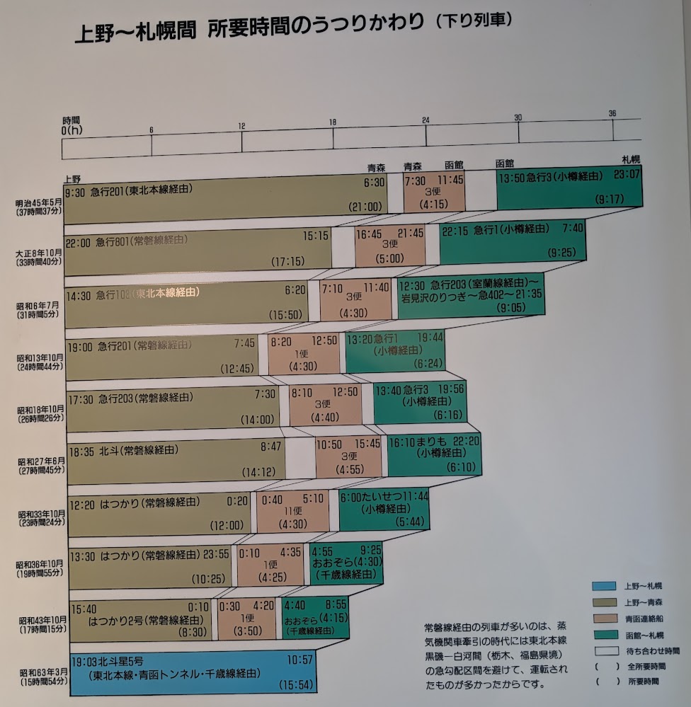 It was fascinating to see how the cost and length of the journey changed over the years. To get from Tokyo to Sapporo, it went from 36 hours in the 1910s to 15 hours in 1988, while the ferry went from 3 yen to 2000 yen.